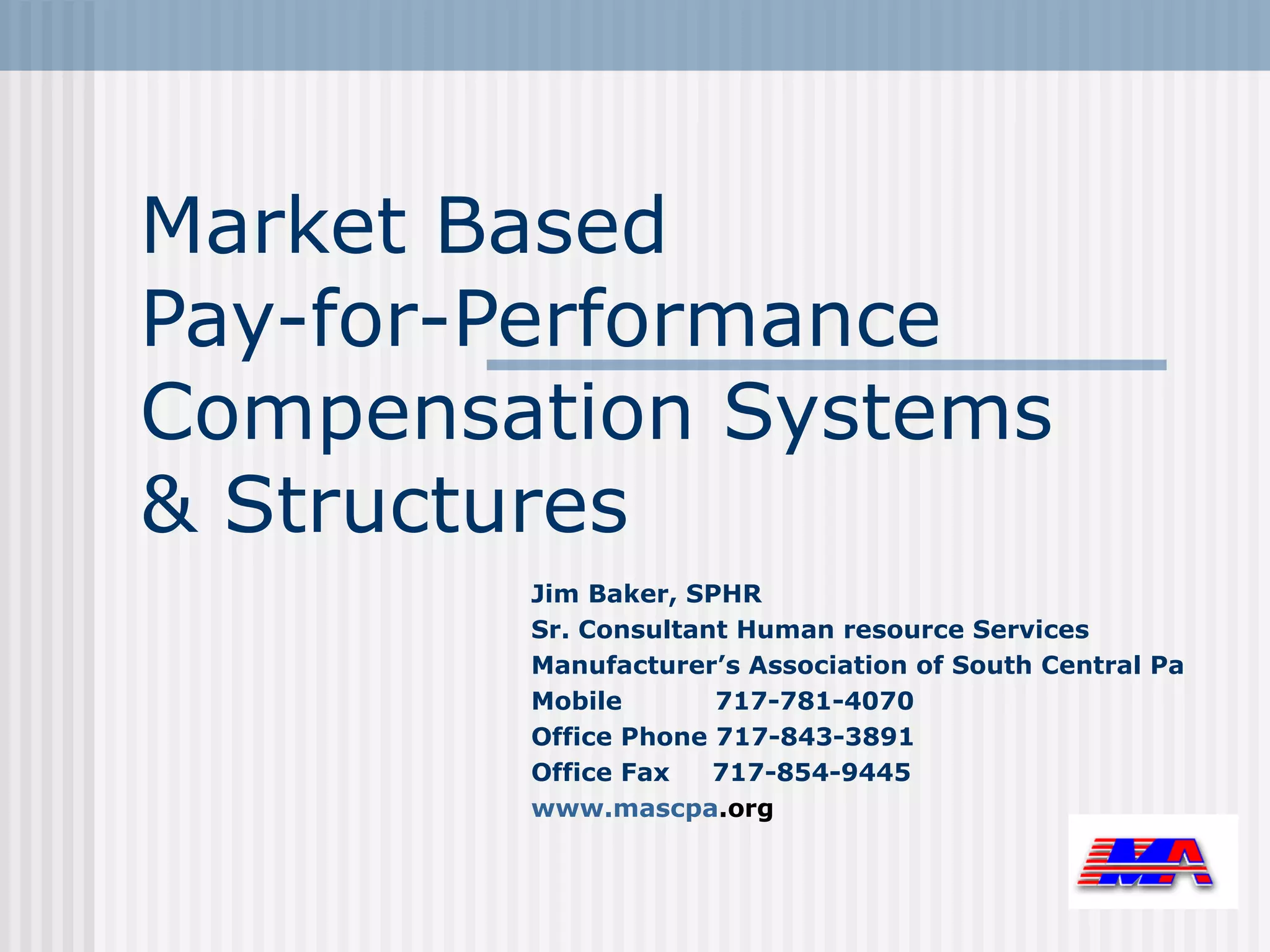 The document discusses pay-for-performance compensation systems and structures. It covers regulatory concerns around pay equity, objectives of compensation including attracting and retaining talent, total compensation including base pay and benefits, developing salary structures with competitive pay ranges tied to performance, and using market data to determine competitive pay positioning. The goal is to link individual performance and compensation through a structured system that complies with regulations and market practices.