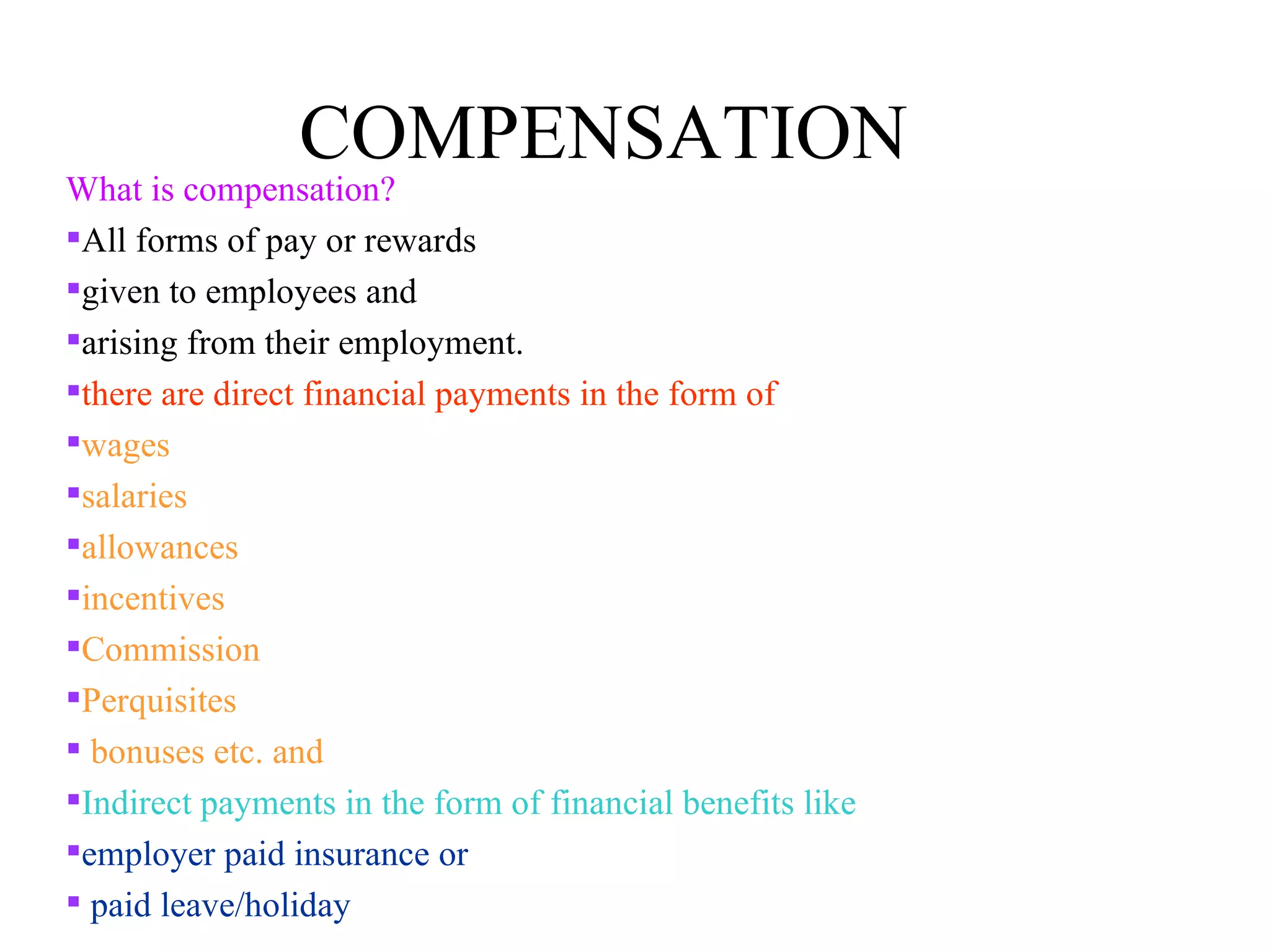 Compensation includes all forms of pay given to employees arising from their employment, including direct financial payments like wages and salaries as well as indirect payments like benefits. Compensation can be time-rated, paid based on time spent, or piece-rated, paid based on units produced. Statutory requirements regulate compensation and include minimum wages, bonus payments, and leave policies. Determining compensation also considers factors like internal and external equity, demand and supply of labor, and organizational policies.