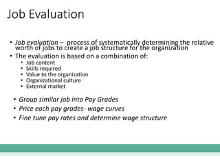 The document provides a comprehensive overview of job evaluation and compensation strategies, highlighting the processes used to determine job worth, organization pay structures, and various types of compensation and rewards. It discusses the components of compensation, including intrinsic and extrinsic rewards, as well as factors influencing compensation levels such as labor market conditions and organizational needs. Additionally, it outlines incentive plans, wage policies, and the importance of maintaining internal, external, and individual equity in employee compensation.