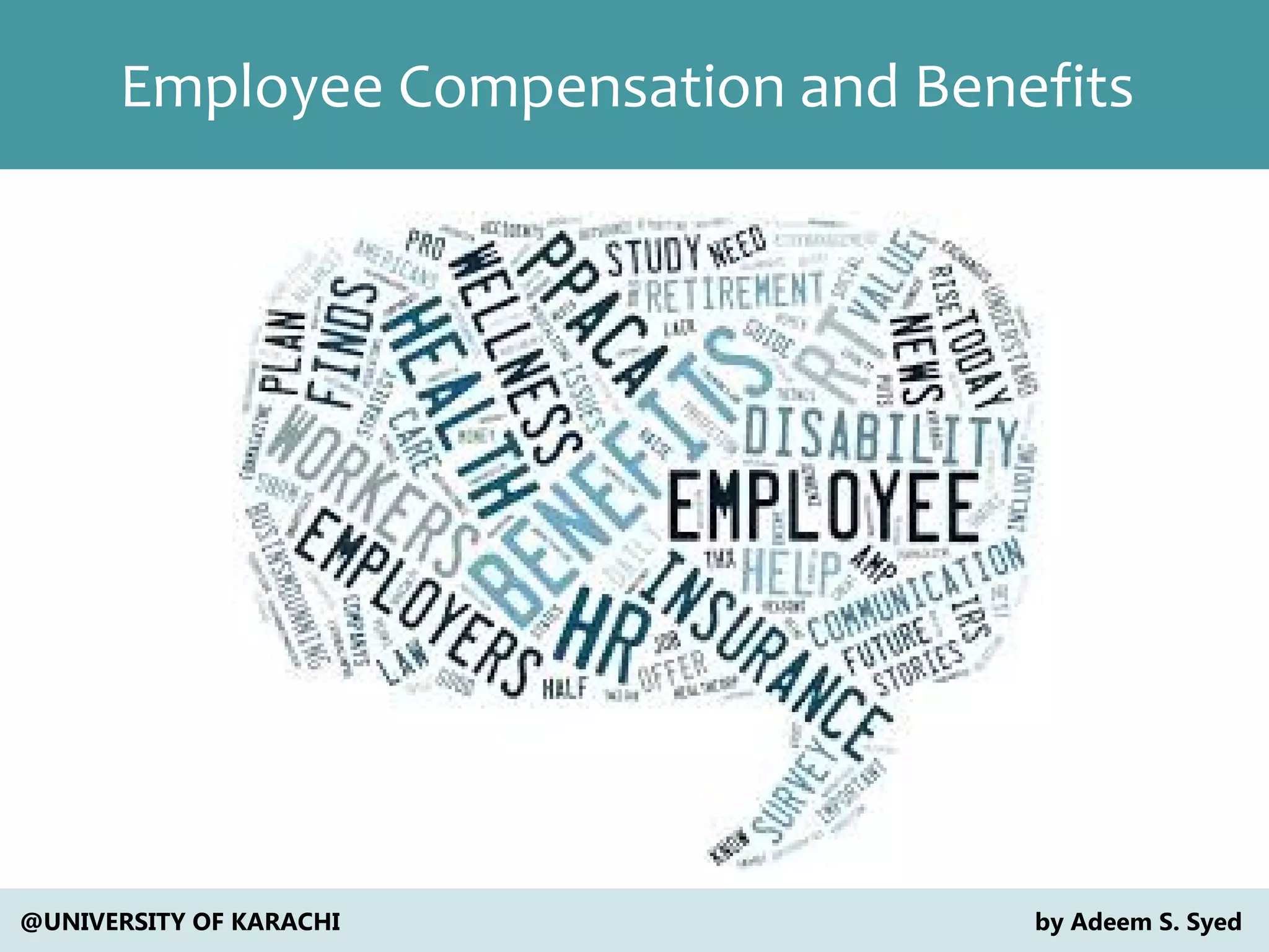 The document discusses employee compensation and benefits at the University of Karachi, highlighting the importance of a diverse range of financial and non-financial rewards for employees. It emphasizes the need for employers to effectively communicate the total value of compensation packages, including benefits that go beyond salary, while also managing rising costs and complex benefit administration. Ultimately, it underscores that well-structured benefits contribute to employee satisfaction, retention, and motivation, serving as a crucial component in employer-employee relations.