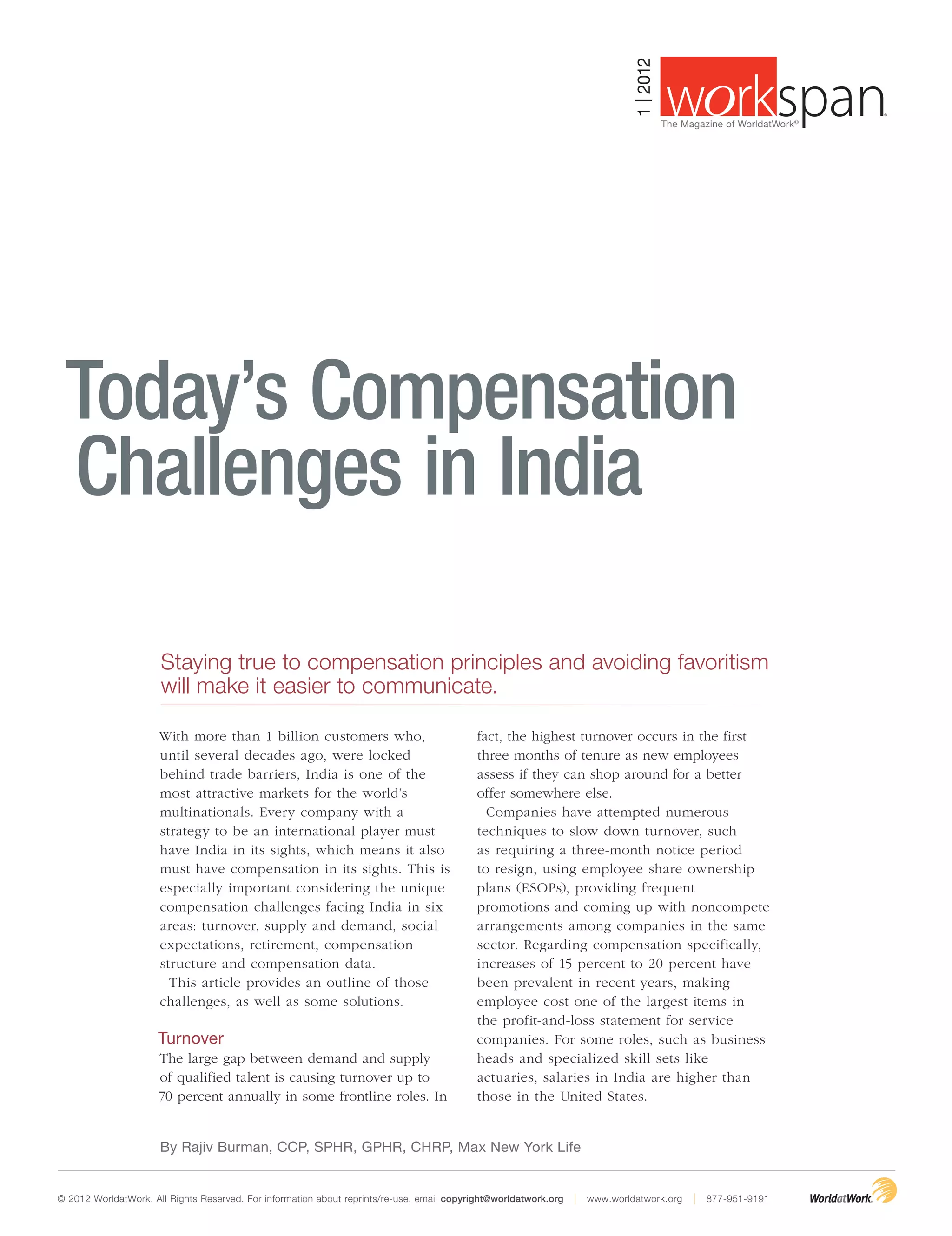 1. India faces unique compensation challenges due to high employee turnover, an imbalance of supply and demand for talent, social expectations around status and promotions, a lack of robust retirement systems, and a complex compensation structure.