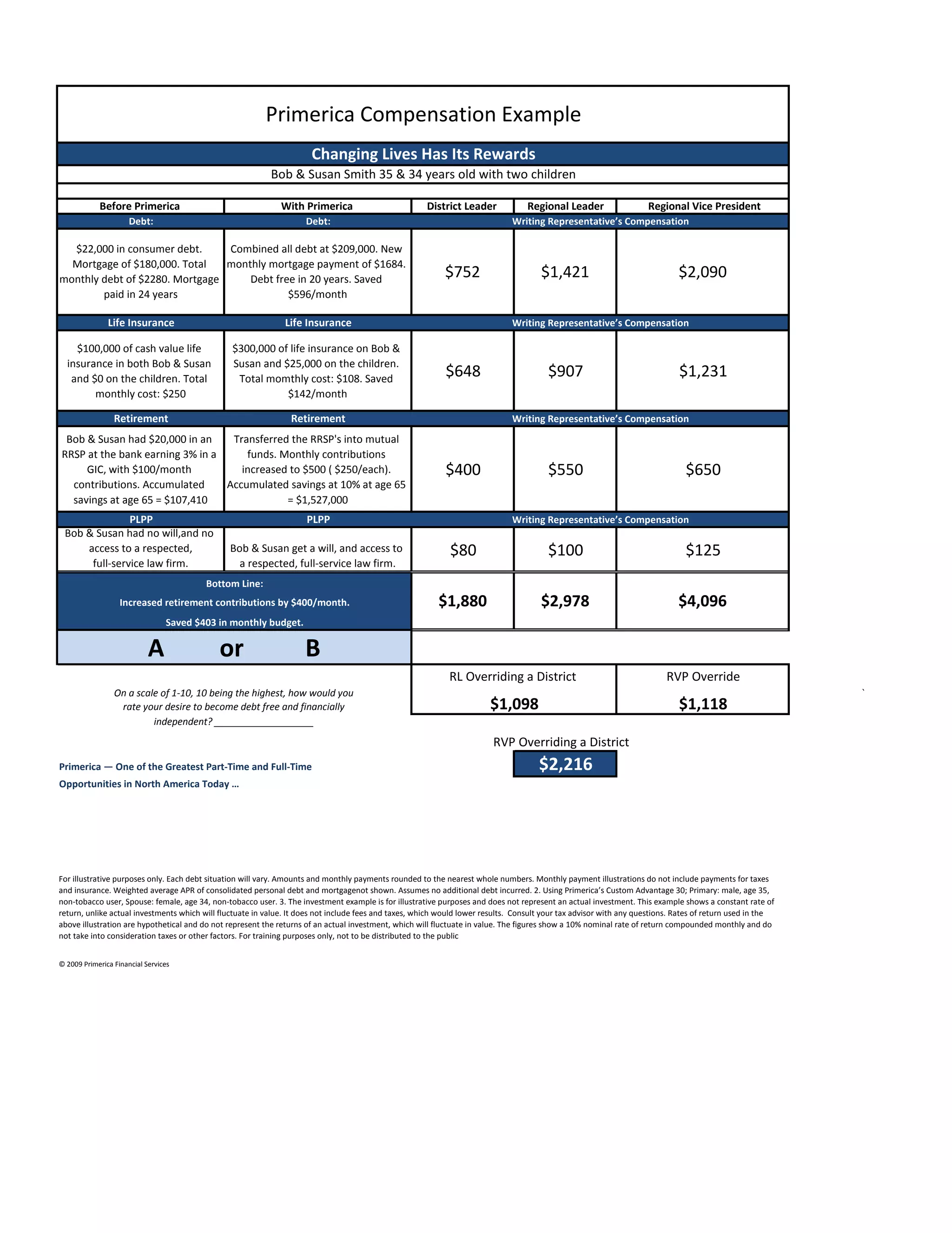 The document outlines the financial journey of Bob and Susan Smith, detailing their debts and the improvements made after engaging with Primerica, including becoming debt-free in 20 years and increasing their retirement contributions. It highlights their life insurance investments and savings growth through mutual funds. The information is illustrative and emphasizes that actual investment returns may vary.