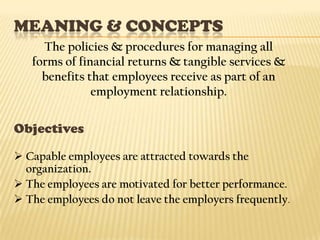 Compensation management involves managing all forms of financial returns and benefits that employees receive as part of their employment. It aims to attract capable employees, motivate performance, and reduce employee turnover. Elements of compensation include wages/salaries, bonuses, economic benefits like paid holidays, insurance contributions, transport and medical facilities, and retirement benefits. Key factors that determine compensation are labor supply and demand, cost of living, productivity, and profits. Job evaluation determines the relative worth of jobs in an organization. Common types of wages include minimum wages, fair wages, living wages, and skill or competency-based pay plans. Compensation management also addresses pay equity and uses incentives like service awards, profit sharing, and stock options to further motivate employees.