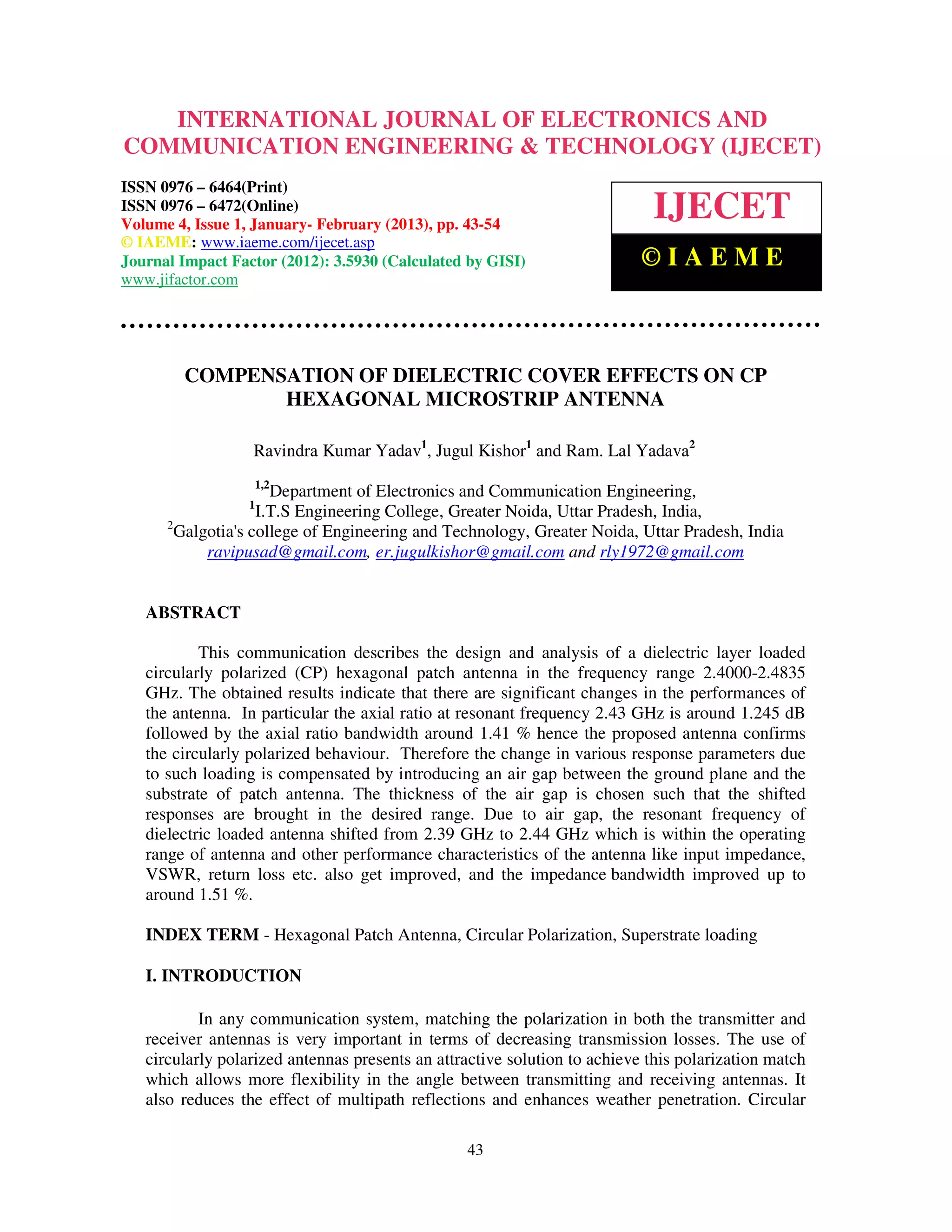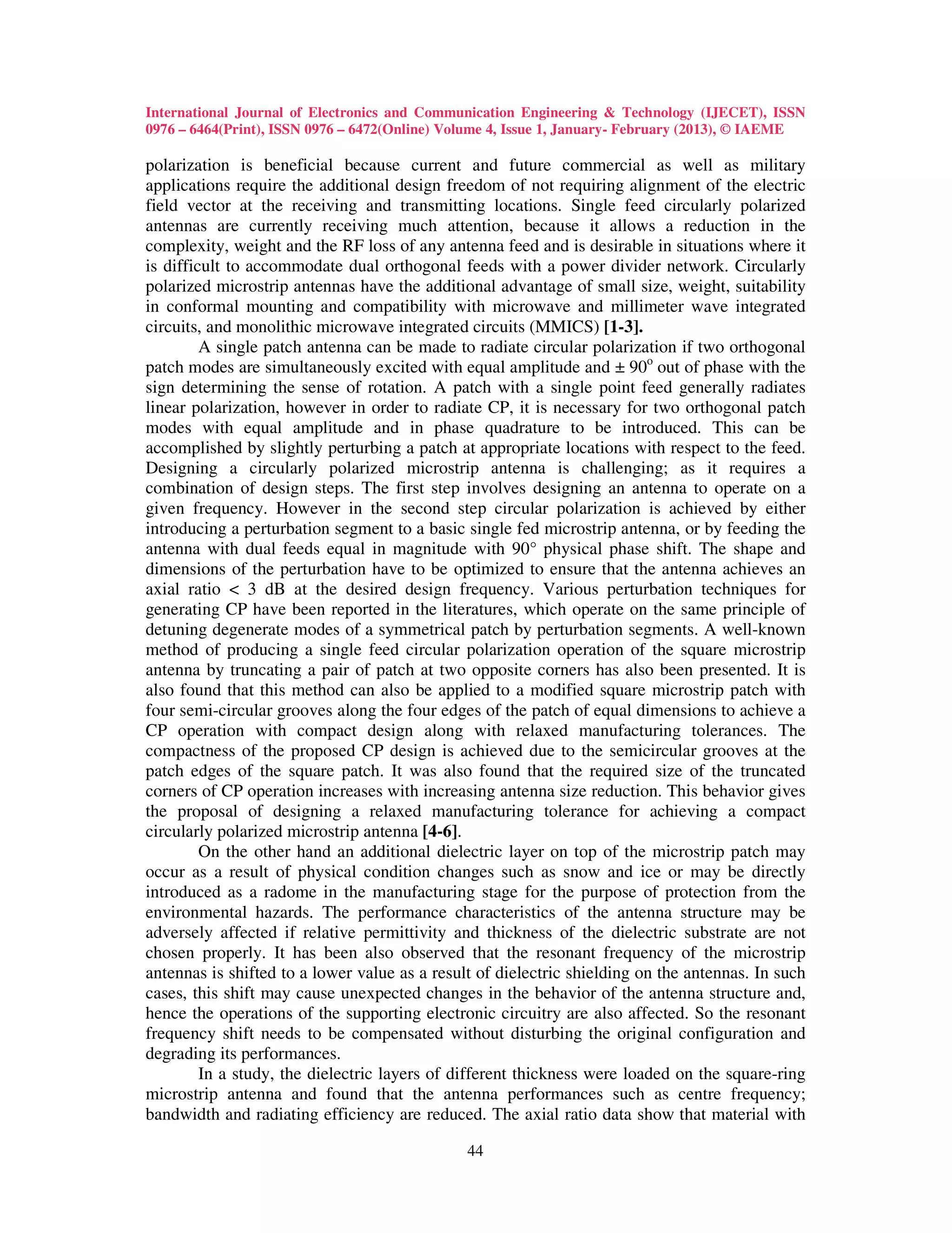This document summarizes a research article that examines the effects of a dielectric cover layer on the performance of a circularly polarized hexagonal microstrip antenna. It first describes how circular polarization is achieved in patch antennas and discusses previous work on perturbations used to generate circular polarization. It then explains how additional dielectric layers can negatively impact antenna characteristics like resonant frequency and efficiency. The document proposes using an air gap between the dielectric layer and ground plane to compensate for these effects. It provides design specifications for the hexagonal antenna and shows simulated and fabricated antenna models. The research aims to maintain antenna performance while adding a protective dielectric cover layer.