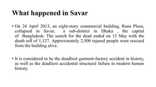 The document discusses the tragic Rana Plaza building collapse in Savar, Bangladesh, on April 24, 2013, which resulted in 1,127 deaths and over 2,500 injuries, highlighting its significance as the deadliest garment factory accident in history. It also addresses the inadequacies of compensation practices for victims in Bangladesh and proposes a scientific methodology for determining fair compensation based on projected future earnings and life expectancy of the deceased workers. The authors argue that the proposed compensation amounts should be higher than what the government has offered, emphasizing the need for more structured compensation frameworks in less developed countries like Bangladesh.
