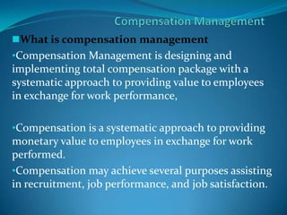 Compensation management involves designing total compensation packages to attract, motivate and retain employees. It includes direct monetary compensation like salary and incentives, as well as indirect compensation like benefits. Compensation objectives are to recruit and retain talent, boost morale and performance, and ensure legal and internal pay equity. Various factors like an employee's role, skills, market pay and organizational budget affect compensation. Common components of compensation include salary, bonuses, statutory benefits, and stock ownership plans.