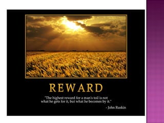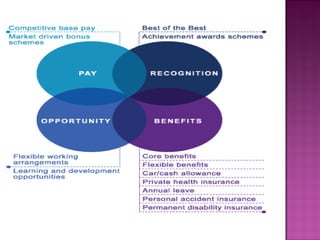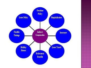 The document discusses compensation and rewards in the workplace. It defines compensation as the total reward an employee receives in exchange for their services, including both direct pay and indirect benefits. Workers' compensation originated in Germany in the 1800s and spread to the US in the 1930s-1940s to financially protect injured workers. Compensation management aims to recruit and retain qualified employees through fair compensation according to the worth of their jobs. Compensation can include base pay, commissions, bonuses, and other financial and non-financial rewards. Companies establish compensation philosophies to determine fair pay, bonuses, and incentives over time to attract and keep good employees.