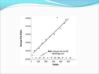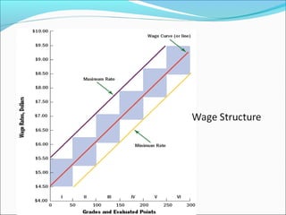 This document discusses factors that determine pay rates, including various legal considerations and legislation. It outlines the main components of employee compensation as direct financial payments and indirect financial payments. The key steps in establishing pay rates are conducting a salary survey, performing job evaluation to group similar jobs into pay grades, pricing each grade, and fine-tuning rates. Job evaluation methods include ranking, classification, point method, and factor comparison. Legislation discussed includes the Minimum Wages Act, Payment of Wages Act, and Equal Remuneration Act in India as well as the Davis-Bacon Act, Walsh-Healey Act, Civil Rights Act, Fair Labor Standards Act, and Equal Pay Act in the US.