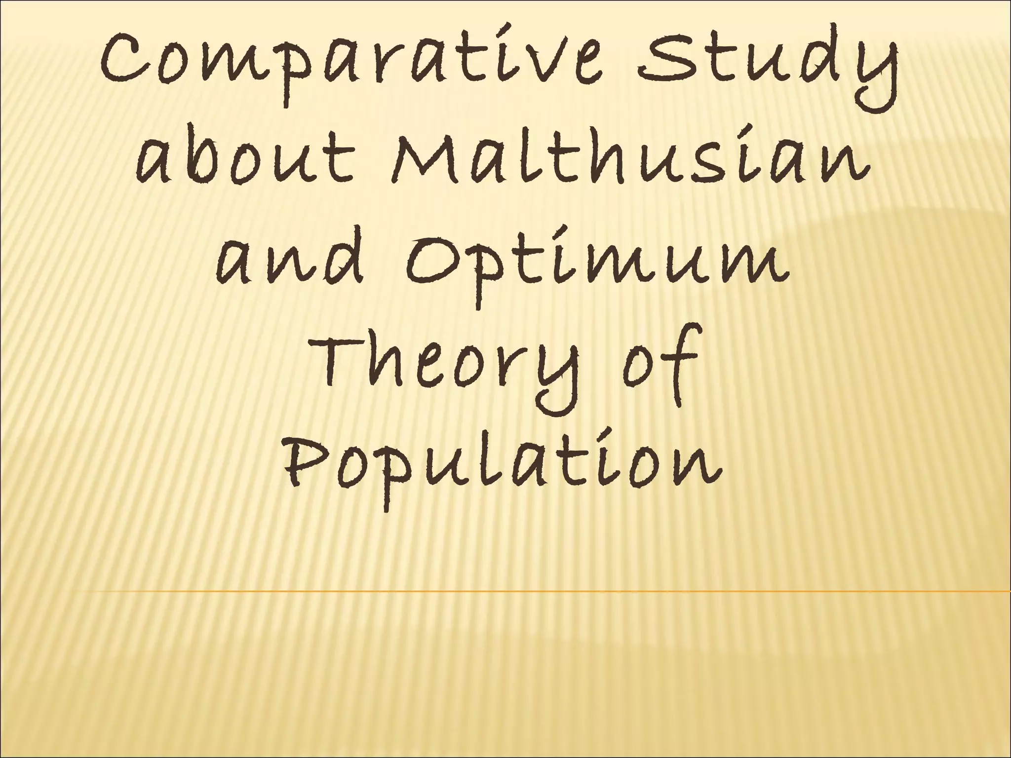 This document summarizes a comparative study between Malthusian and Optimum theories of population. It includes sections on Malthusian theory, its features and criticisms, and a summary stating that population increases geometrically while food supply increases arithmetically, resulting in imbalance. The Optimum theory section explains that population is neither under nor over at the optimum level, and compares it to Malthusian theory by noting it is more optimistic and scientific by considering population control and national resources. Photos and bibliography sections are also included.
