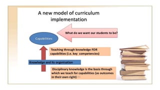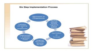 The document discusses competency-based and outcomes-based education. It defines key terms like competency-based approach and outlines common components of competency-based models which include partnerships between community colleges and four-year programs. The document also discusses defining outcomes at the beginning of curriculum development rather than predetermined contents. It recommends five core competencies for health professionals and discusses limitations of outcome-based education like not providing understanding of why learning is important.