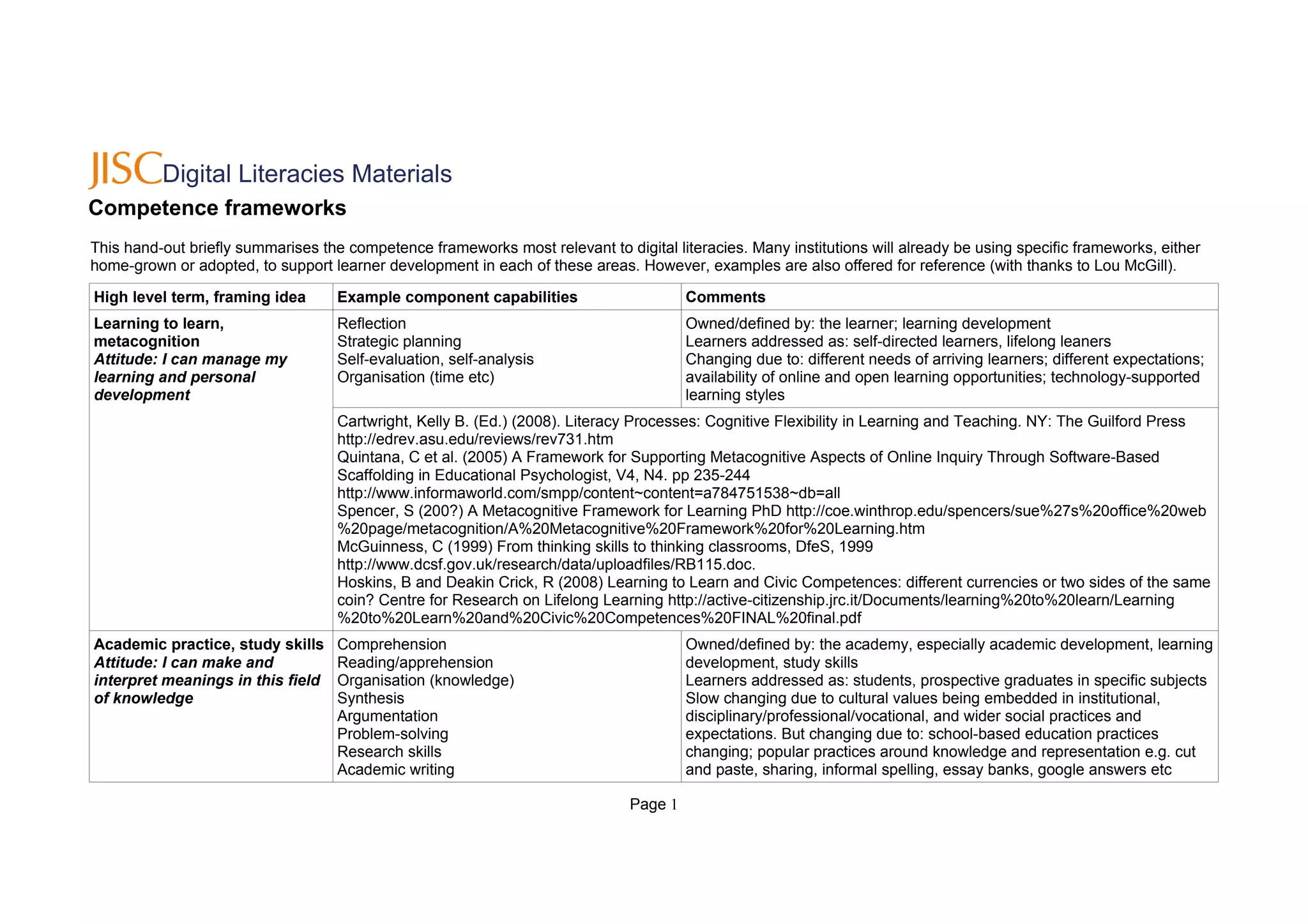 This document summarizes several competence frameworks relevant to digital literacies. It lists high-level terms for different competencies including learning to learn, academic practice, information literacy, communication skills, media literacy, ICT literacy, employability, and citizenship. For each competency, it provides examples of component capabilities and comments on how the frameworks are defined and changing over time.