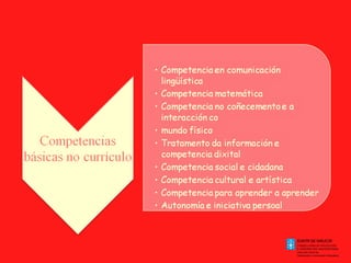4. Competencias básicase currículo. (1) Obxectivos de etapa Contidos Obxectivos de área/materia Criterios de avaliación Estado Comunidade Autónoma Centro Profesorado Forman parte das enseñanzas mínimas da educación obrigatoria, xunto con obxectivos, contidos e os criterios de avaliación. Forman parte tamén do currículo establecido pola Comunidade Autónoma