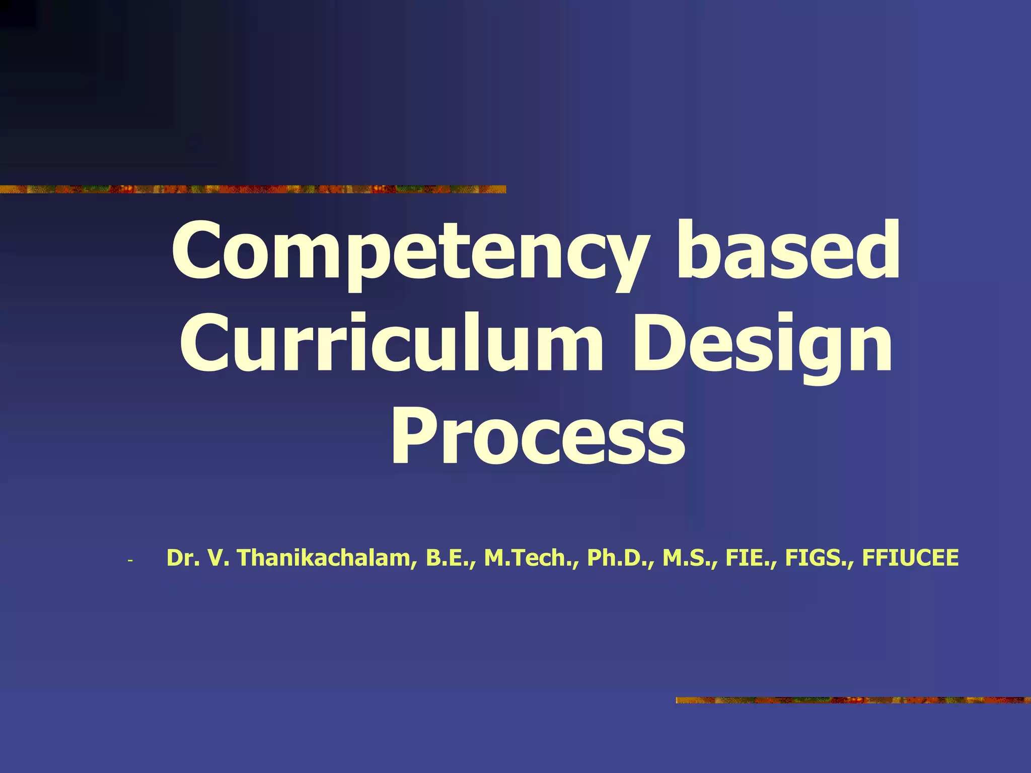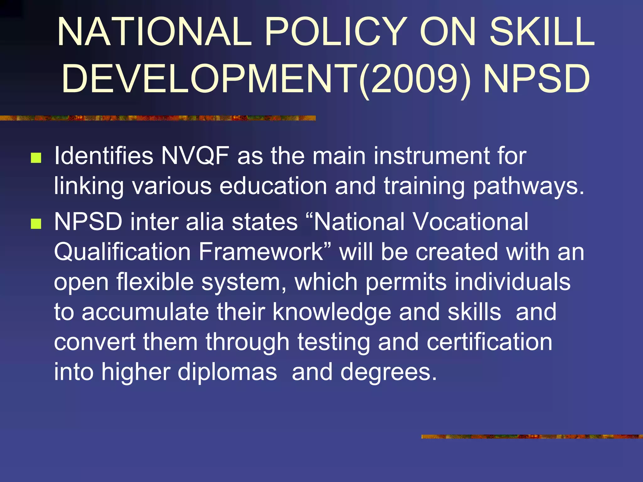 The document outlines the competency-based curriculum design process as per the National Policy on Skill Development, focusing on the National Vocational Qualification Framework (NVQF) and National Vocational Educational Qualification Framework (NVEQF) that organize qualifications across various levels. It highlights the need to align educational outcomes with industry needs to facilitate lifelong learning, skill development, and employment readiness while establishing standards for vocational training. Additionally, it emphasizes the roles of Sector Skill Councils and the integration of industrial needs into educational objectives and curriculum design.
