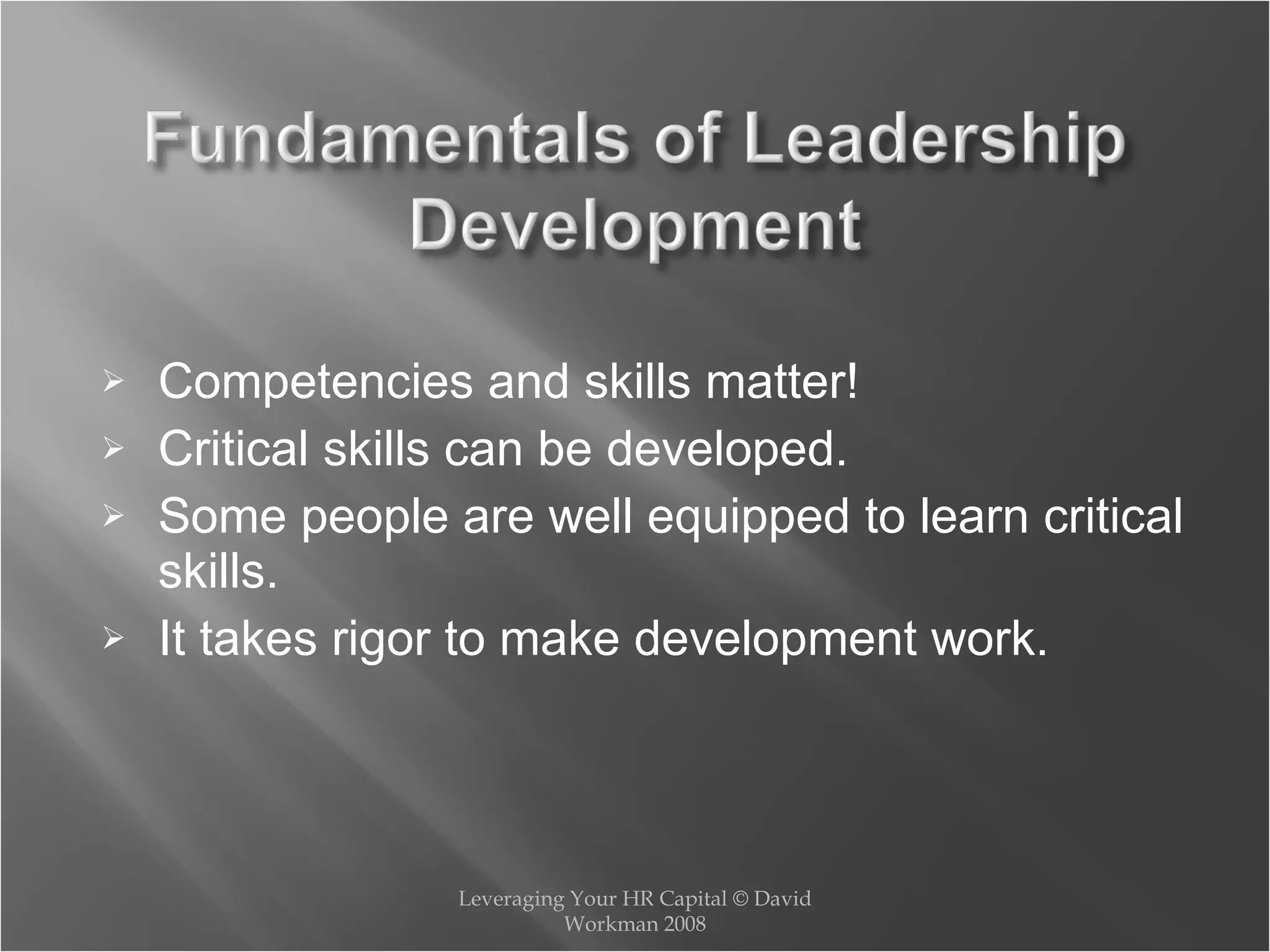 The document discusses competency based leadership development. It states that 85% of common skills for effective management are known, and that the skills needed to do a job are mostly consistent. It also discusses that adults learn from experience, and some people learn better from experience than others. The document advocates for organizations to have best practices and systems to effectively develop current and future leaders.