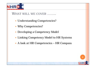 The document discusses competencies, including understanding competencies, why competencies are important, and developing a competency model. It defines competencies as underlying characteristics that are causally related to superior job performance. Developing a competency model involves identifying the competencies required for effective performance, defining behaviors associated with each competency, and applying the model to human resource systems like staffing, learning, performance management and rewarding. Linking competencies to these systems can help align them with business strategy and goals.