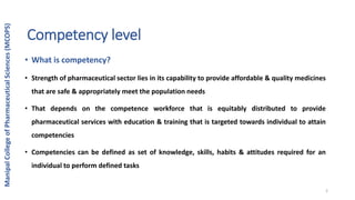 The document discusses competency levels in the pharmaceutical sector. It defines competency as the set of knowledge, skills, attitudes, and habits required to perform defined tasks. The International Federation of Pharmaceutical Physicians and Pharmaceutical Medicine (IFAPP) introduced competency levels to the pharmaceutical industry and identified 7 domains and 60 core competencies. A competency framework defines the competencies required to perform specific pharmaceutical sector tasks and can guide competency-based education and training programs. Individual competency development needs can be assessed through self-assessment of competency levels in various tasks.