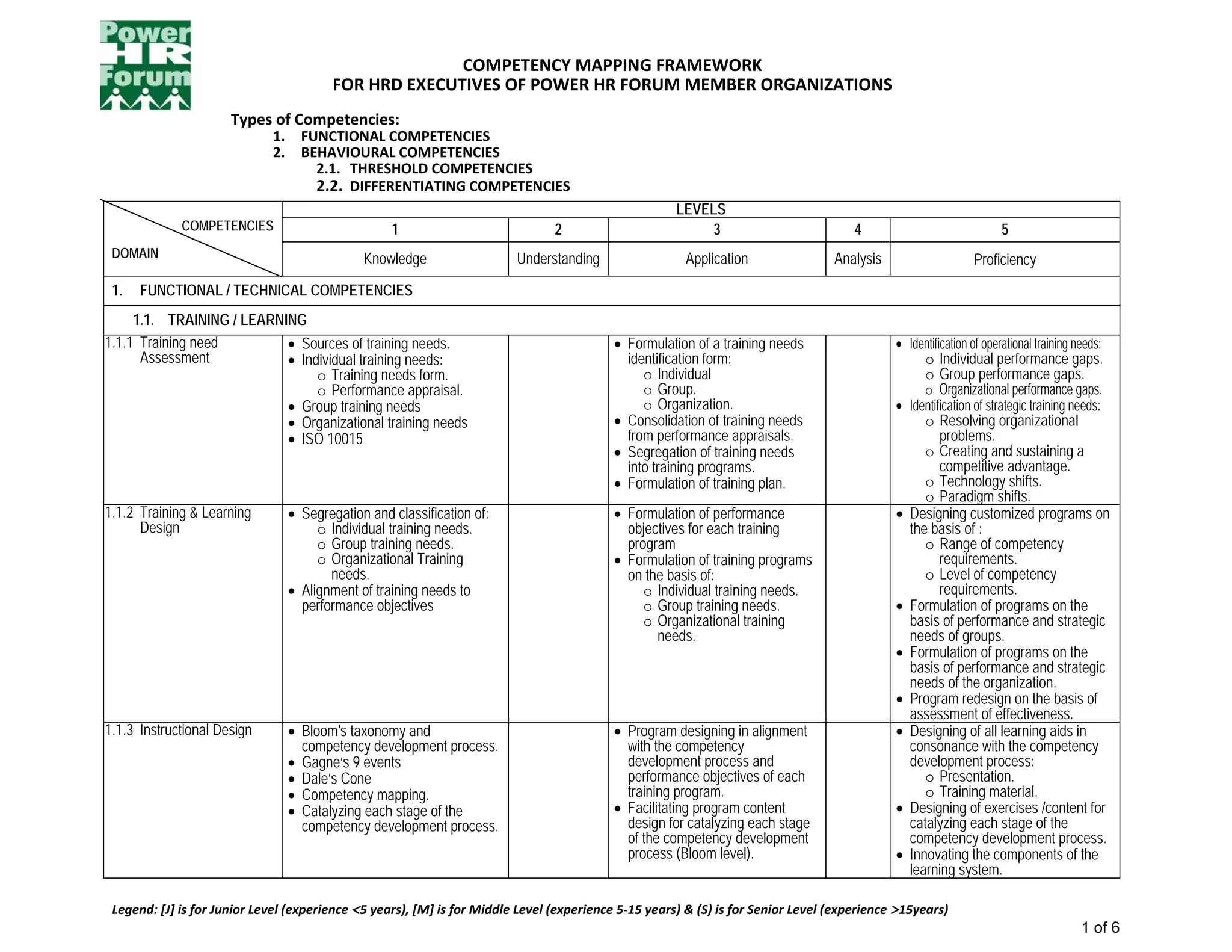 This document outlines a competency mapping framework for human resource development executives. It details five levels of competencies from knowledge to proficiency across two domains: 1) Functional/technical competencies which include training/learning assessment, design, instructional design, and delivery and 2) Behavioral competencies including threshold and differentiating competencies. Each competency is defined at each level with increasing independence, analysis, and application of skills. The framework provides guidance on competencies required for HRD executives at different stages of their career.