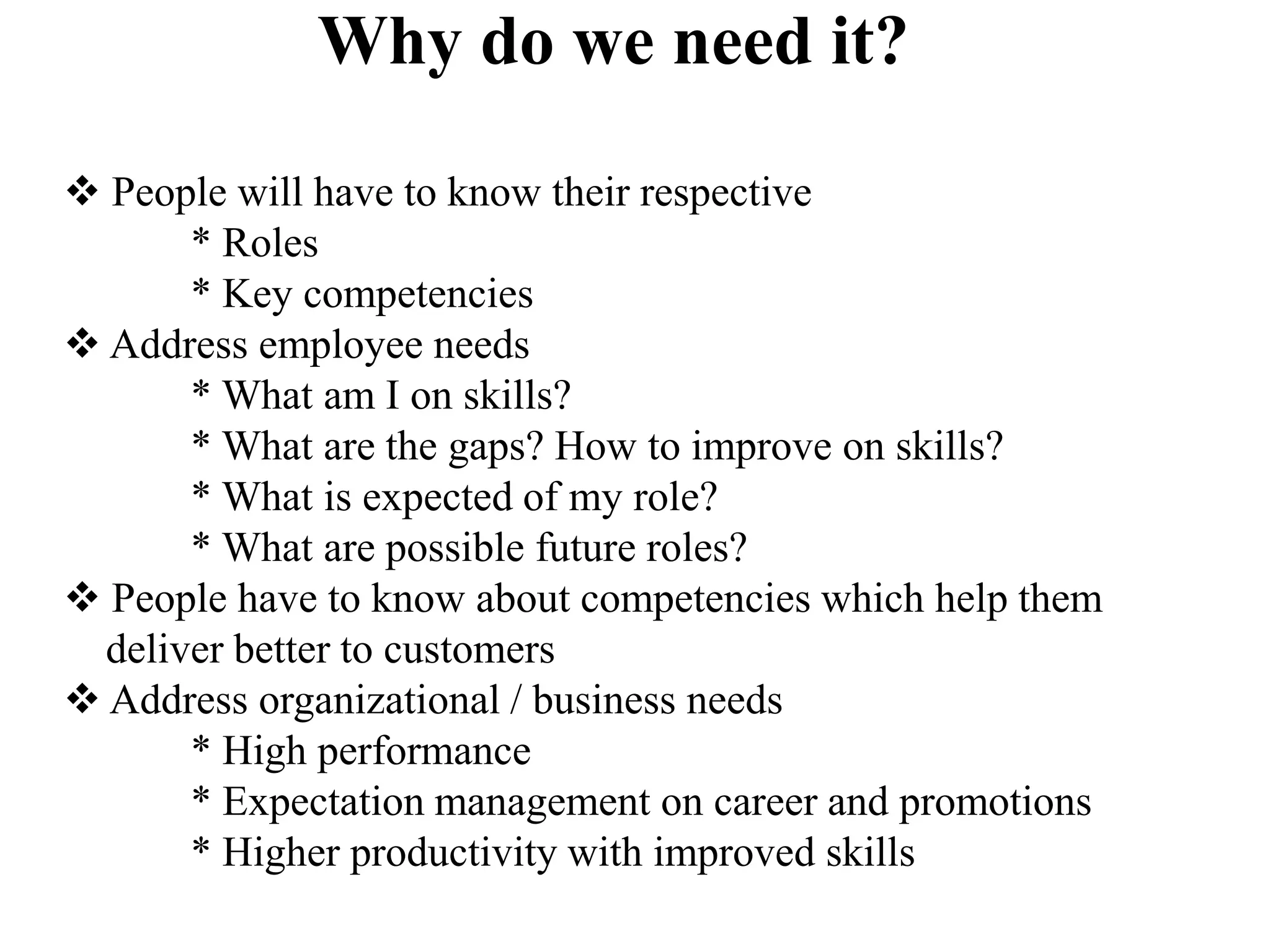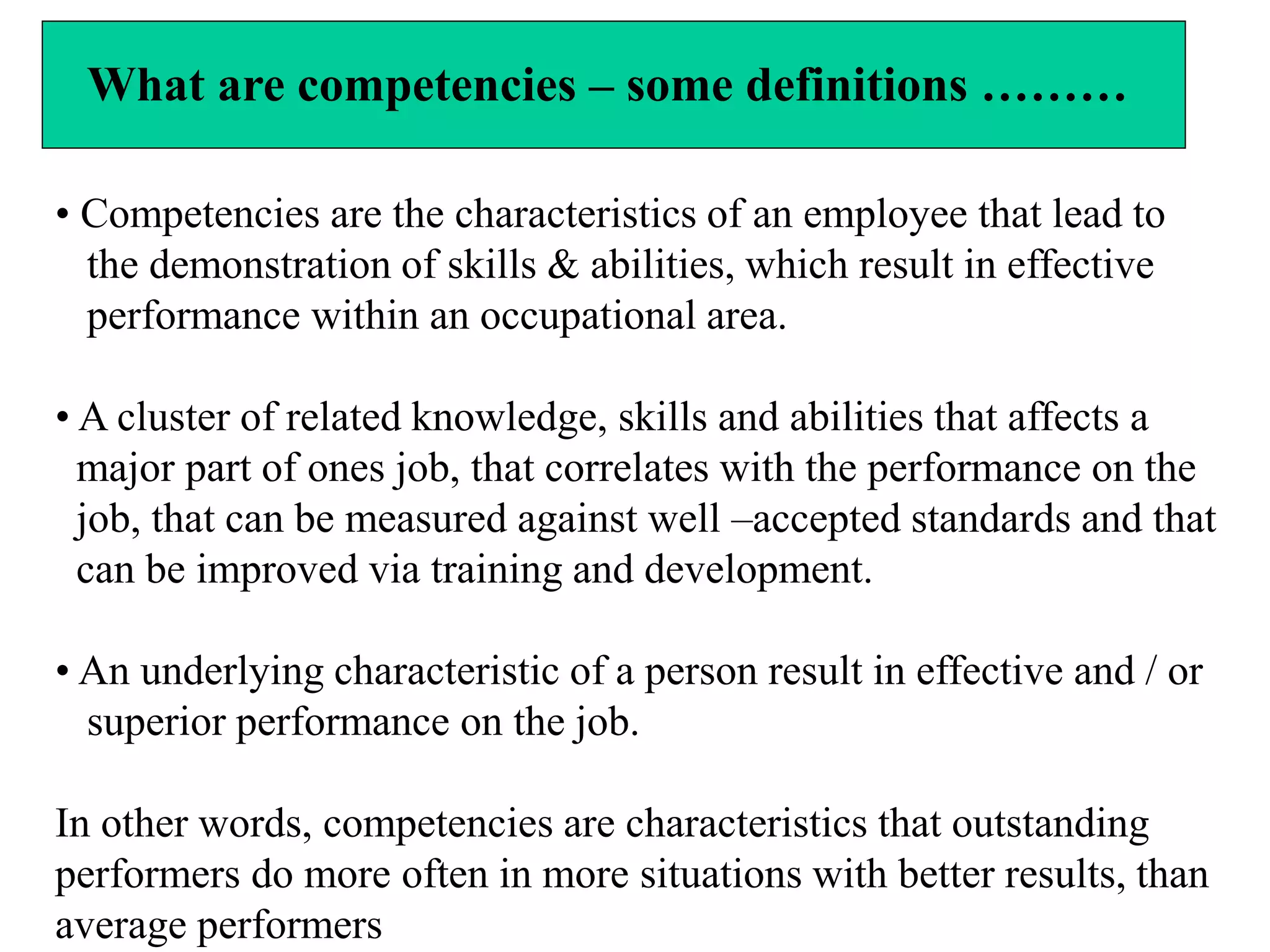 The document defines competencies as characteristics that lead to effective job performance, including skills, knowledge, abilities, and behaviors. Competency models identify the competencies needed for different roles and levels of work. Developing competency models involves collecting data through methods like behavioral interviews, expert panels, surveys, and job analysis. Models can be designed for specific jobs, functions, levels, or the whole organization. The level of proficiency in competencies expected varies by role and seniority.