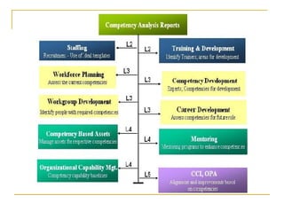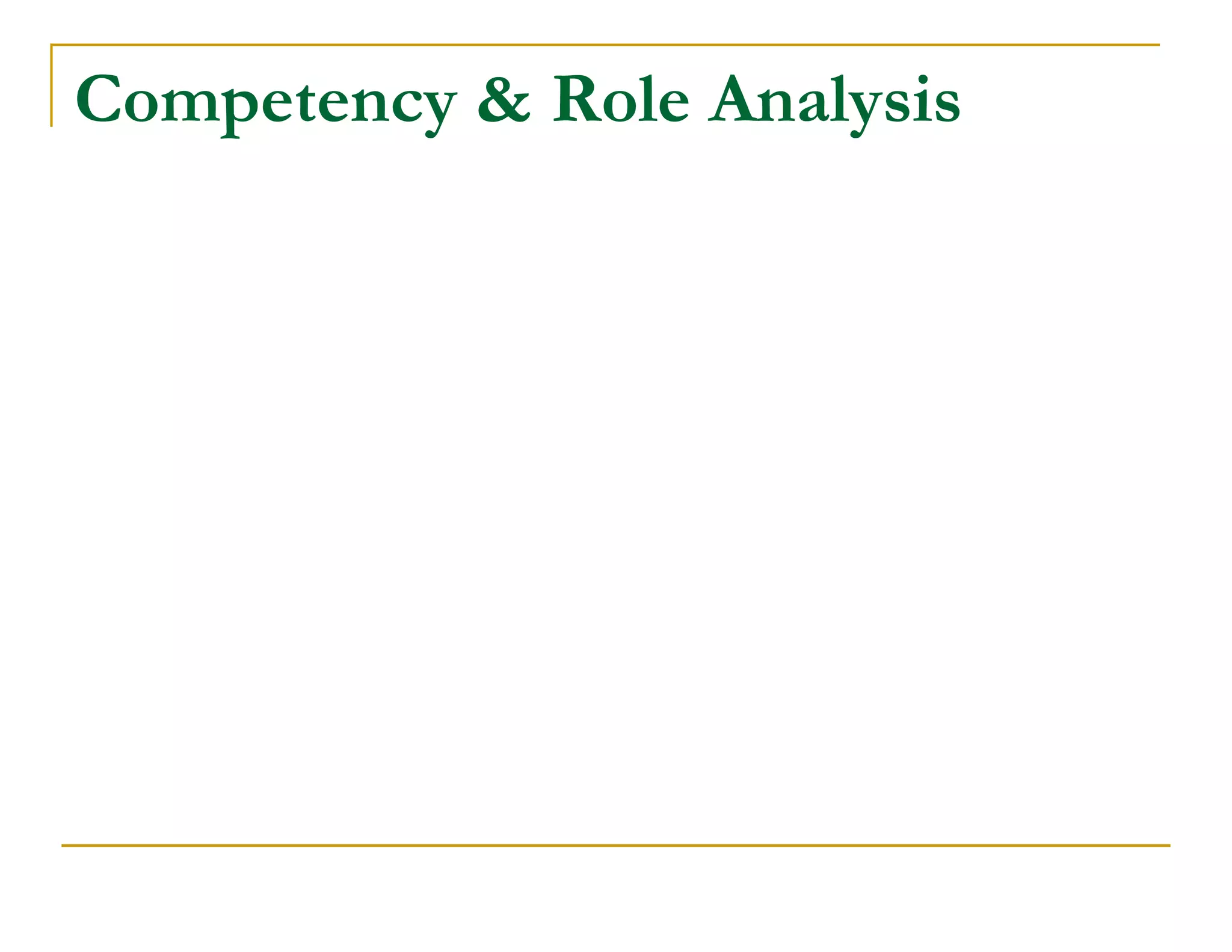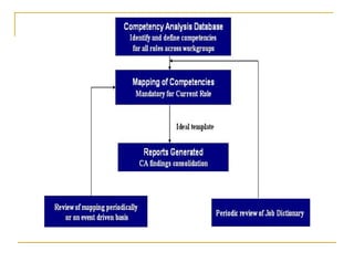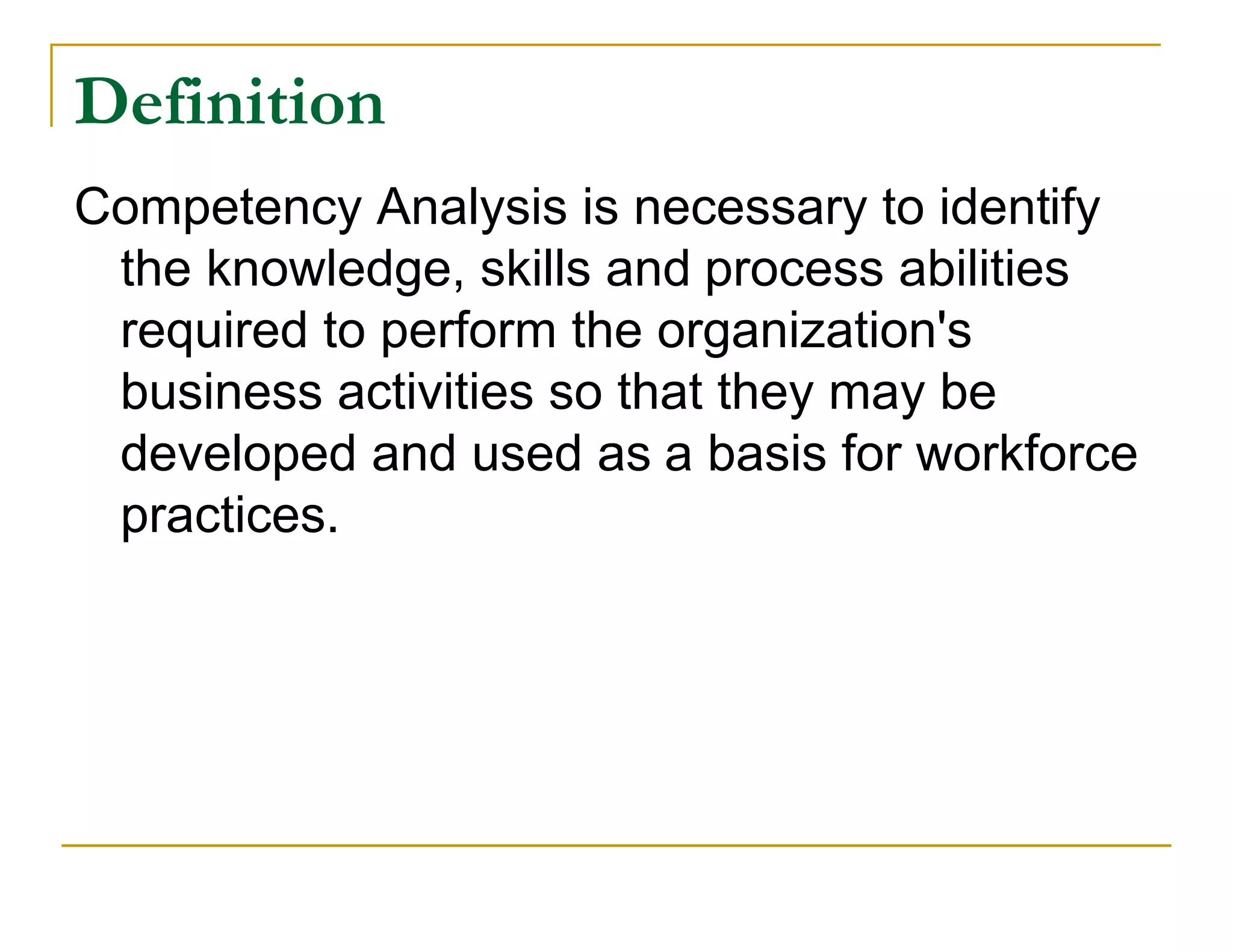 This document discusses competency analysis, which identifies the knowledge, skills, and abilities required to perform organizational roles and business activities. It defines competency analysis and outlines a methodology. A seven-step process is described that includes planning, using methods like task analysis to define competencies, and describing competencies. Goals include defining and updating competencies, tracking capability, and institutionalizing competency analysis practices. Sources of competency information and impacts like development and transparency are also discussed.
