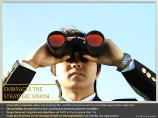The document discusses embracing a strategic vision by aligning with an organization's mission, devising plans to achieve the corporate vision, thinking creatively outside norms to generate new ideas, and communicating ideas to gain support from others while focusing on long-term success rather than resistance.