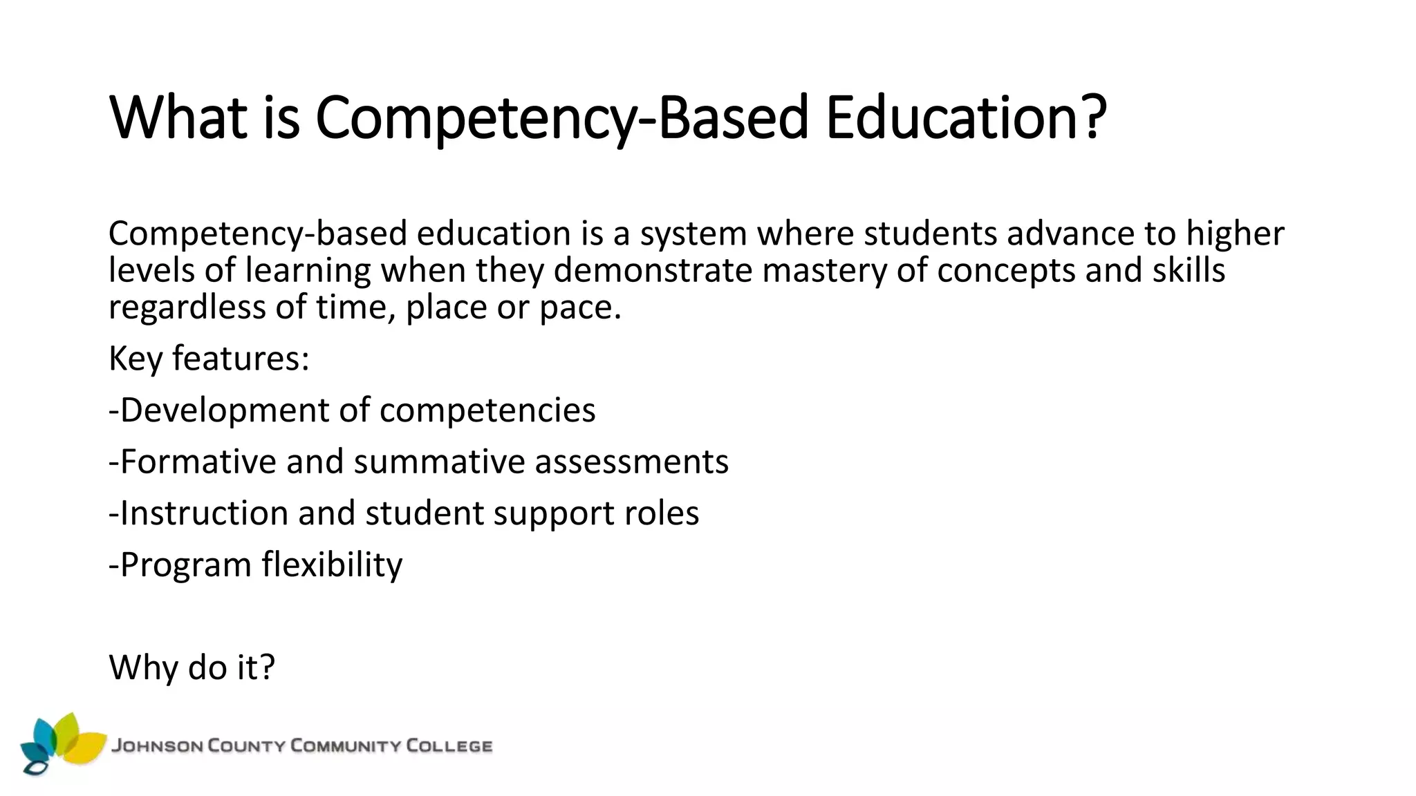 Competency-based education is a system where students advance based on demonstrating mastery of concepts and skills rather than time spent in class. Key features include developing competencies, formative and summative assessments, flexible instruction and support. Competency-based programs are growing in popularity, with up to 600 colleges working on such programs. They allow students to progress at their own pace by demonstrating competencies through assessments rather than seat time.
