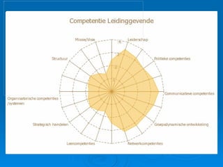 Leiderschap De leidinggevendeheeft zicht op sterktes en zwaktes van zijn eigen leiderschapsstijl. De leidinggevende kan sturen en coachen waar nodig (situationeel leiderschap). De leidinggevende kan zijn medewerkers inspireren en boeien. De leidinggevende kan delegeren. De leidinggevende kan omgaan met ‘te veel’ taken en gevarieerde taken.