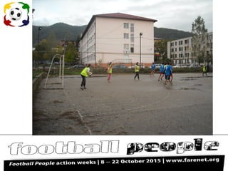The document summarizes a sports competition called "Football People Action Weeks" that took place from October 8-22, 2015 and was coordinated by the Physical Education and Sports Department at Colegiul Tehnic "Aurel Vlaicu" in Baia Mare, Romania. It lists some of the best teams that participated, including classes 9A, 9B, and 9C. It also names Valentina Tarța from class 9A as the most technically skilled player and says the real winners were friendship, respect, and tolerance.