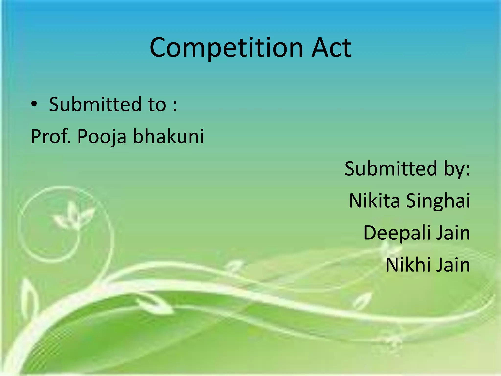 1. The Competition Act of 2002 established the Competition Commission of India to prevent anti-competitive practices and promote fair competition.