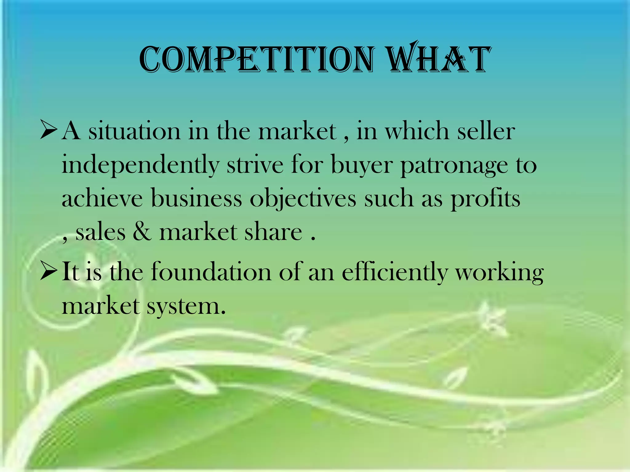 The document discusses competition and India's competition policy and law. It defines competition and explains its importance for consumers and economic growth. It outlines the objectives of India's competition policy to promote efficiency, innovation, and economic growth.