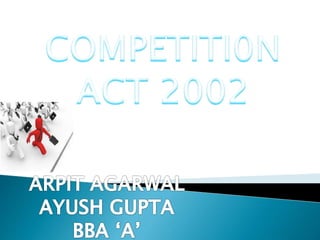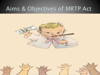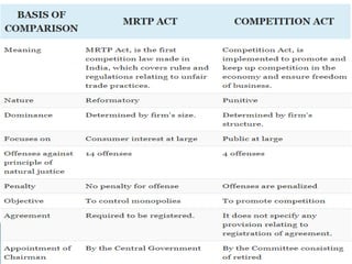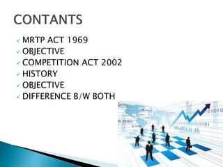 The document discusses the Monopolies and Restrictive Trade Practices Act (MRTP Act) of 1969 and the Competition Act of 2002 in India. The MRTP Act aimed to prevent concentration of economic power and prohibit anti-competitive practices. It was replaced by the Competition Act of 2002, which established the Competition Commission of India to prevent anti-competitive activities and promote fair competition for consumers and businesses. The key objectives of both acts were to ensure competition in the market and protect consumer interests.