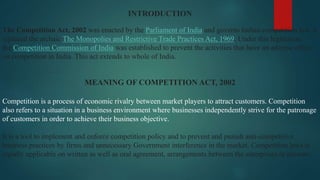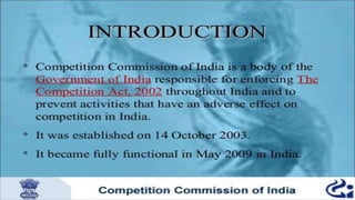 The Competition Act of 2002 established the Competition Commission of India to prevent anti-competitive practices. The Act prohibits anti-competitive agreements between enterprises, abuse of dominant position by enterprises, and regulates combinations (mergers and acquisitions) that are likely to cause an adverse effect on competition in India. It aims to promote fair competition in the market for the benefit of consumers. The key features of the Act include defining anti-competitive agreements and abuse of dominant position, regulating combinations, and establishing penalties for non-compliance.