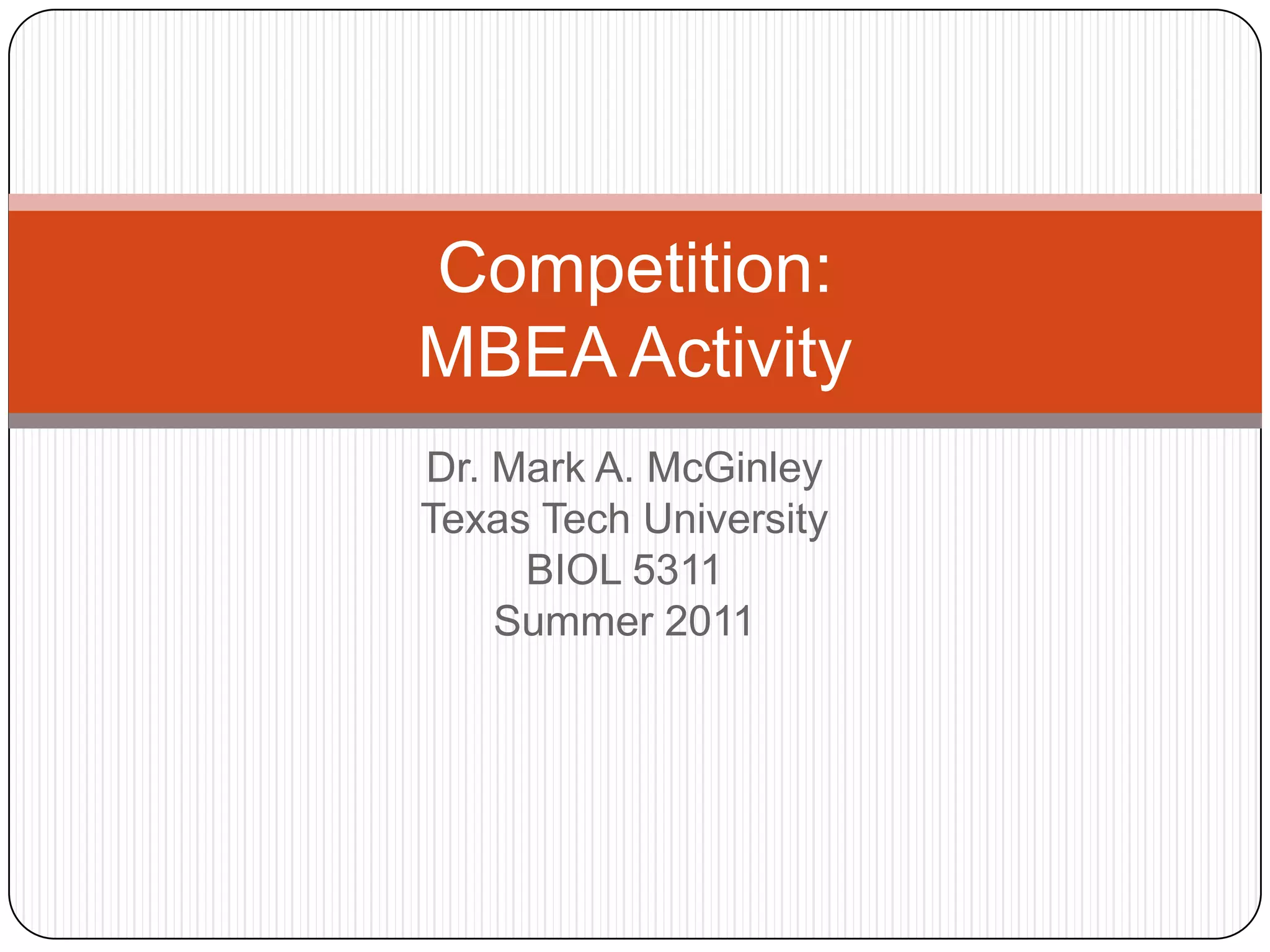 This document discusses competition between ecological populations. It defines competition and describes different types, including intraspecific and interspecific competition. Mechanisms of competition include interference and exploitative competition. The effects of competition can include changes to population size, spatial dispersion, phenotypes, and biodiversity. Competition can be studied through models, observations, and experiments. The competitive exclusion principle and niche differentiation are introduced as ways that species can coexist by reducing competitive interactions. Character displacement is given as an example of niche differentiation. The document then discusses a case study on competition between insectivorous bat species in Malaysia.