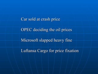 The document summarizes India's Competition Act of 2002 and outlines its objectives to promote fair competition in the market. It discusses different anti-competitive practices like cartels and abuse of dominance that the Act prohibits. It also describes the roles and powers of the Competition Commission of India in regulating combinations, enforcing the Act through penalties, and advocating for competitive markets through non-enforcement measures.