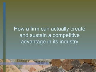 The document discusses Michael Porter's analysis of competitive advantage through his concept of the value chain. It provides an overview of Porter's view that competitive advantage can be achieved through either cost leadership or differentiation. It then explains Porter's value chain framework which identifies primary and support activities that can contribute to cost leadership or differentiation. The document outlines Porter's perspectives on analyzing costs, identifying cost drivers, and reconfiguring activities to achieve a competitive advantage through lower costs. It also discusses differentiating products and services in a way that creates value for buyers. The goal is to shift competition from red oceans of head-to-head competition to blue oceans of creating uncontested market space.