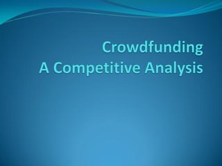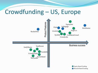 This document provides information on various crowdfunding platforms and their models. It discusses the largest rewards-based platforms like Kickstarter and Indiegogo, as well as equity-based platforms such as EquityNet, Symbid, and CircleUp. It also summarizes regulations around crowdfunding in the US under the JOBS Act and notes that crowdfunding platforms are emerging but still developing in India compared to more established options in Europe and the US.