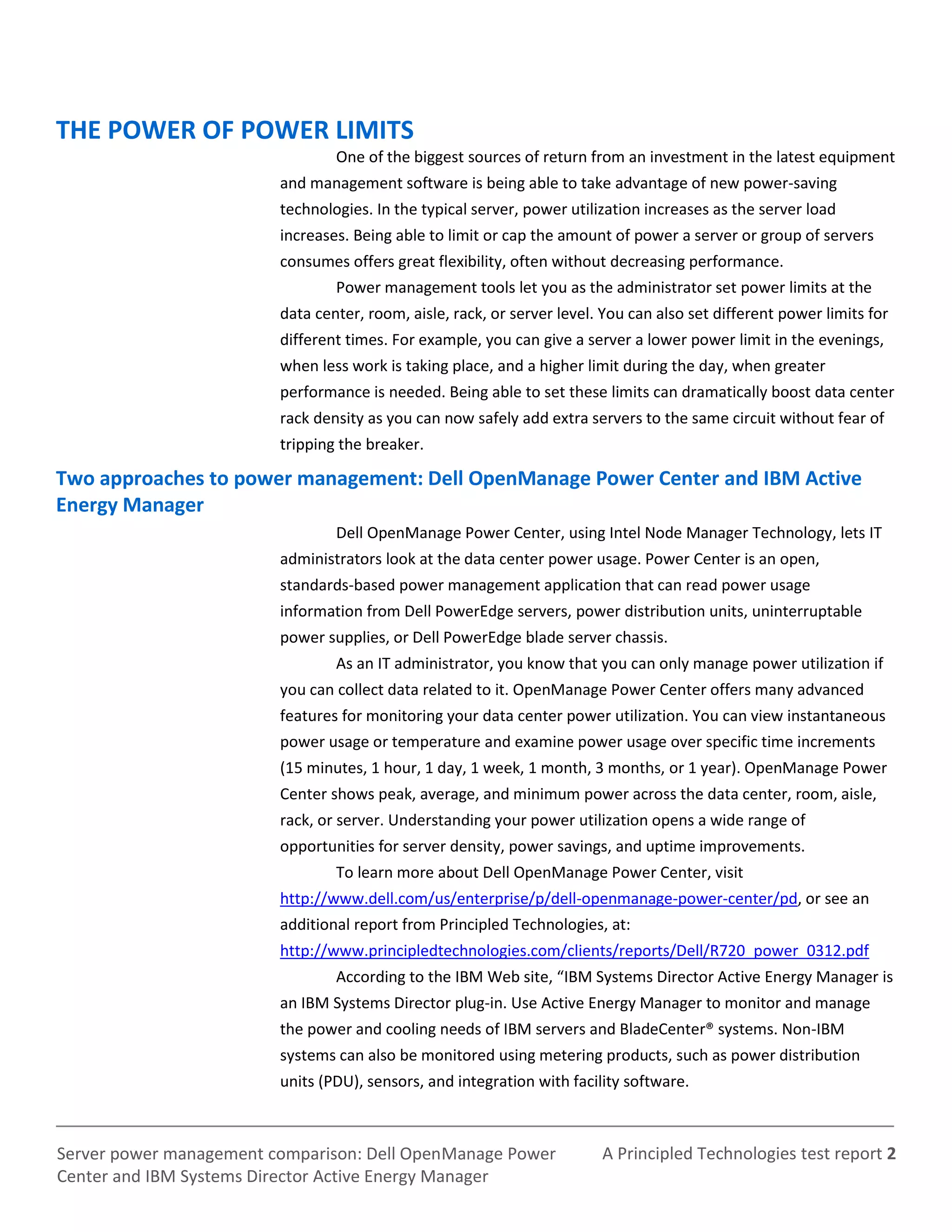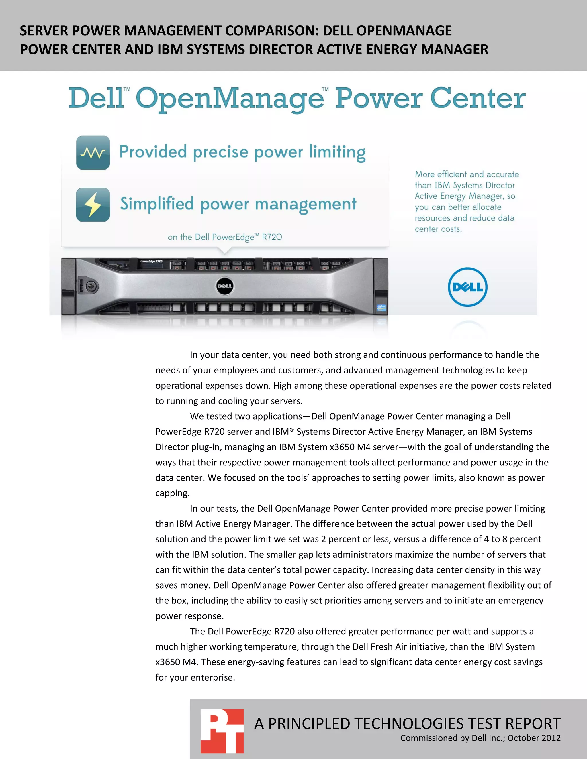 The document compares the power management capabilities of Dell OpenManage Power Center and IBM Systems Director Active Energy Manager. It finds that Dell OpenManage Power Center provided more precise power limiting, with actual power usage within 2% of the set limit, while IBM Active Energy Manager's actual usage was 4-8% lower than the limit. This tighter control with Dell allows for greater server density within the same power capacity. The Dell PowerEdge R720 also offered better performance per watt and supports higher temperatures than the IBM System x3650 M4 tested.
