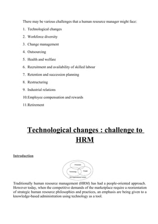 The document discusses several technological challenges facing human resource managers, including technological changes, workforce diversity, and how technology is impacting human resource management practices. Specifically, it notes that technology requires fewer skills from workers, has led to deskilling of some jobs and the need to retrain existing workers. It also discusses how technology allows for more efficient work and remote work. Human resource managers must adapt practices like training, recruitment, and retention to address these technological challenges.