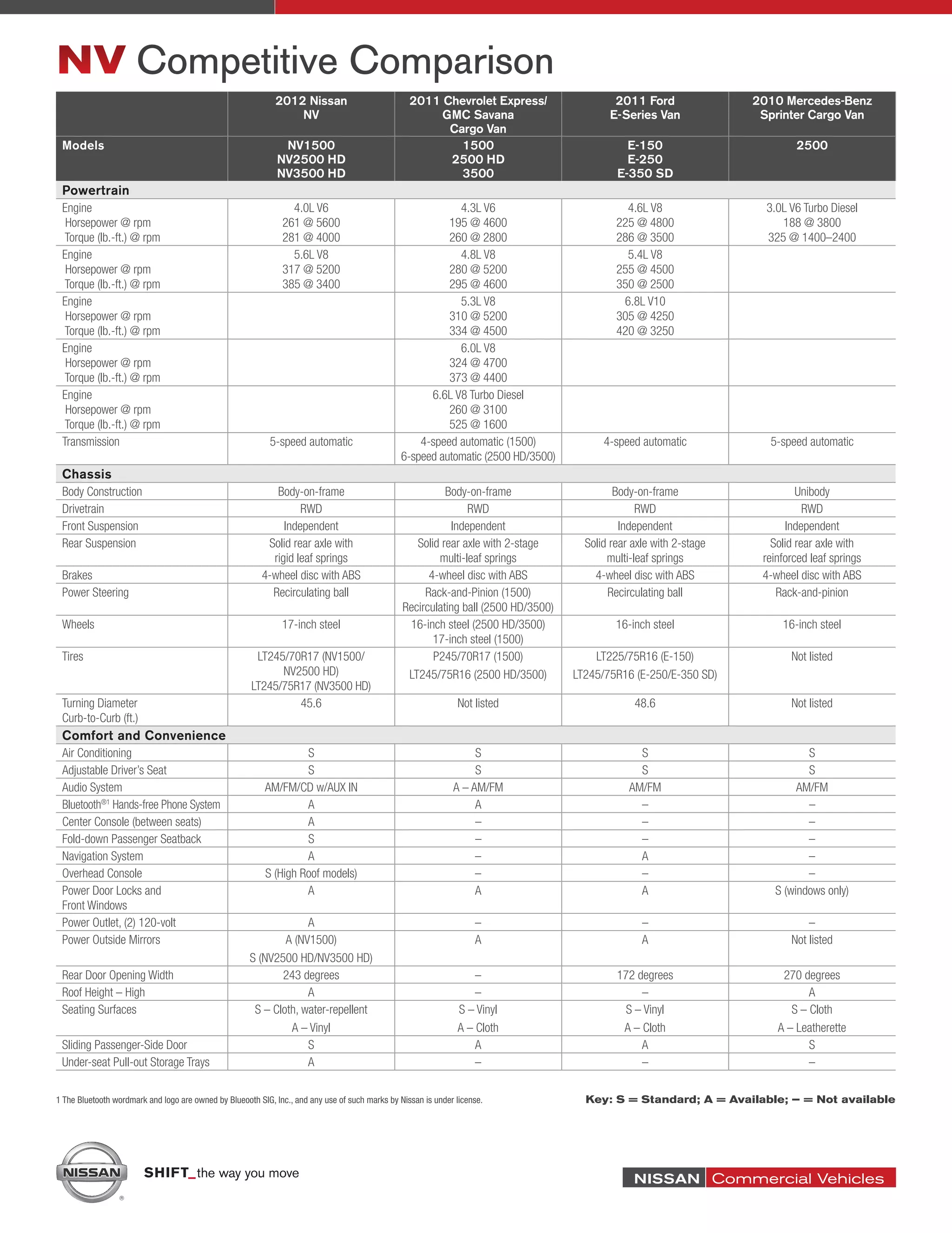 This document compares the specifications of the 2012 Nissan NV cargo van to its competitors, the 2011 Chevrolet Express/GMC Savana, 2011 Ford E-Series, and 2010 Mercedes-Benz Sprinter. It outlines the powertrain, chassis, comfort, and convenience features of each model. The NV offers a 4.0L V6 or 5.6L V8 engine and 5-speed automatic transmission. It has a body-on-frame construction and available all-wheel drive. Standard features include cloth seating, air conditioning, and power door locks. The Express/Savana and E-Series are also body-on-frame with V6 or V8 engine options while the Sprinter has