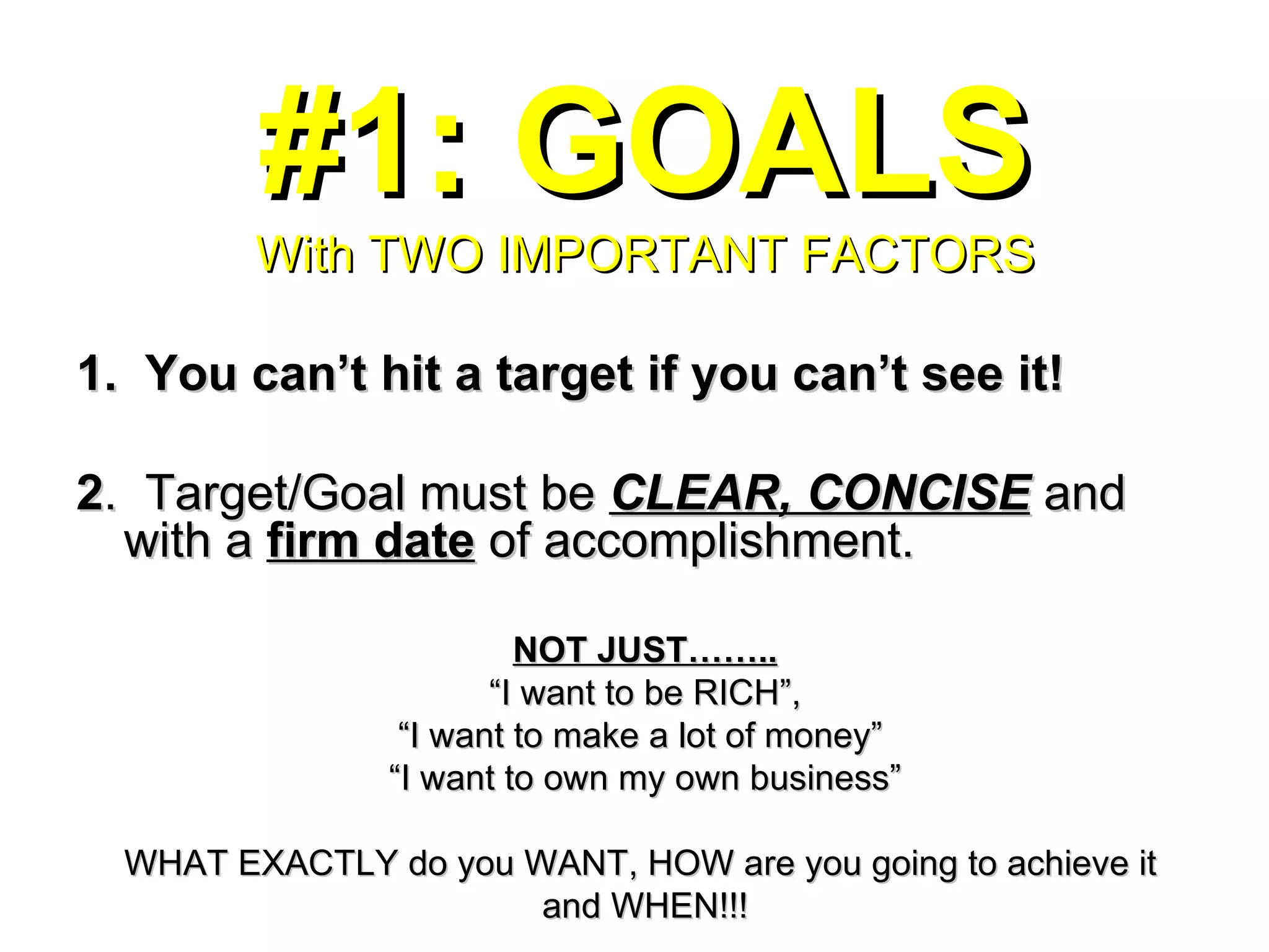 The document discusses four key factors for success: goals, desire, talent, and perseverance. It emphasizes that goals must be clear, concise, and have firm deadlines. Desire comes from within and motivates constant effort. Talent requires specializing in your area of expertise. Perseverance means never giving up and being willing to pay the price for success through positive thinking, actions, and surrounding yourself with supportive people.