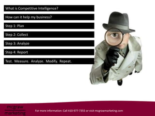 The document outlines the 4 steps of competitive intelligence: plan, collect, analyze, and report. It describes planning questions around target audiences, products/services, pricing, distribution, promotion, and human resources. Information is collected internally from employees and documents, and externally from customers, suppliers, media, and more. Intelligence is then analyzed and reported to help businesses understand competitors and trends.
