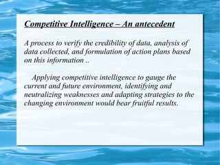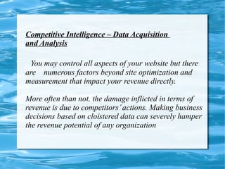 The document discusses the importance of competitive intelligence in enhancing revenue potential by analyzing competitor actions and market conditions. It emphasizes the need for accurate data acquisition and interpretation, identifying weaknesses, and adapting strategies to stay competitive. Additionally, it lists various resources and methods for data analysis that can aid online marketers in making informed decisions.
