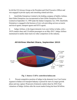 Indigo Airlines is a leading low-cost carrier in India, noted for its operational reliability and efficient service since its inception in 2006, with a current fleet of 97 aircraft. The company, backed by experienced promoters, holds a significant market share of 38.9% in the domestic sector and is positioned for growth with plans to expand operations internationally and diversify into cargo and app-based services. Indigo's strategic focus on maintaining low costs and on-time performance has enabled it to capture valuable market opportunities while also positively impacting stakeholders.