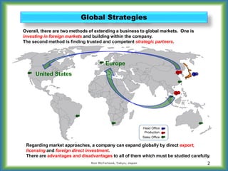 The document outlines various global strategies for business expansion, highlighting methods such as direct export, licensing, and foreign direct investment, along with their associated advantages and disadvantages. It examines vertical integration strategies, emphasizing the benefits of improved trust and communication against the risks of increased fixed costs and decreased flexibility. Additionally, it discusses market entry techniques and competitive dynamics, stressing the importance of assessing competitors' behavior and future demand when expanding or entering new markets.