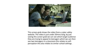 This document discusses and analyzes a cyber safety website aimed at teenagers. It summarizes key aspects of the website, including that it uses a 20-minute video featuring two teenagers in a classroom to relate to its target audience. It also notes that the website provides categories to find more information about cyberbullying, uses easy to understand language written in first person to personally target its audience, and employs bold colors on teen pages to appeal to different age groups.
