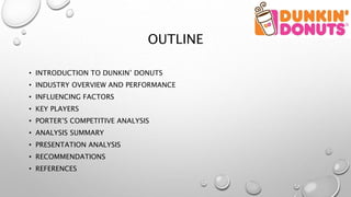 The document provides an analysis of Dunkin' Donuts within the coffee industry using Porter's Five Forces model. It discusses the competitiveness of the market, highlighting factors such as the bargaining power of buyers and suppliers, threats from new entrants and substitutes, and rivalry among existing players. Key opportunities for Dunkin' include improving product quality, enhancing customer relations, and creating differentiation to maintain competitiveness against major rivals like Starbucks.