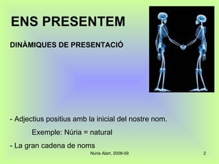 ENS PRESENTEM -Adjectius positius amb la inicial del nostre nom. Exemple: Núria = natural - La gran cadena de noms DINÀMIQUES DE PRESENTACIÓ