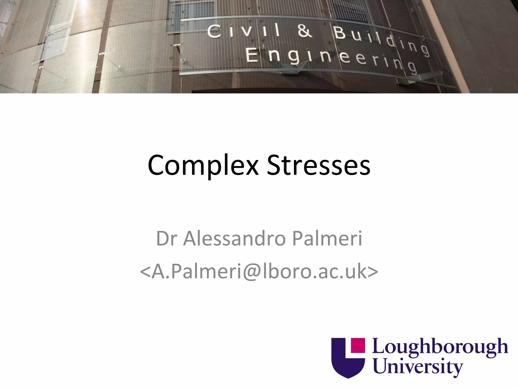 This document contains information about a teaching schedule for a course on complex stresses. It will cover topics like beam shear stresses, shear centres, virtual forces, compatibility methods, moment distribution methods, column stability, unsymmetric bending, and complex stress/strain over 11 weeks. The lectures and tutorials will be led by various staff members. The document also provides motivations for studying complex stresses, which include the fact that failure often results from different stresses acting together, and discussing examples like welded connections, reinforced concrete, and concrete cylinder tests.