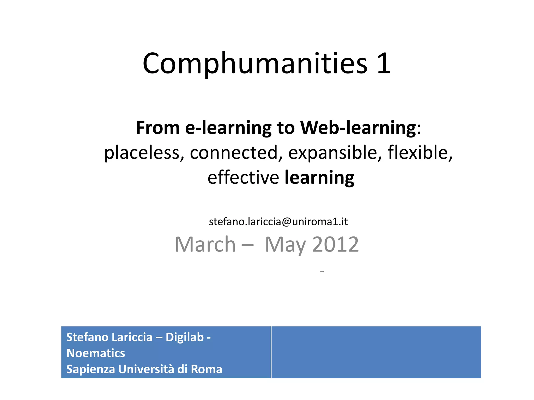 This document discusses an online course on web-based learning. The course objectives are to expose students to knowledge and competencies around different uses of information and communication technologies globally, with a focus on new web-based learning methods. It will provide hands-on experience with web 2.0 tools and allow students to analyze their own web usage. Throughout the course, students will work on collaborative projects using web technologies to benefit diverse learning communities. The document outlines various tools that will be introduced and used in the course, such as content and file management, collaboration, and productivity tools.