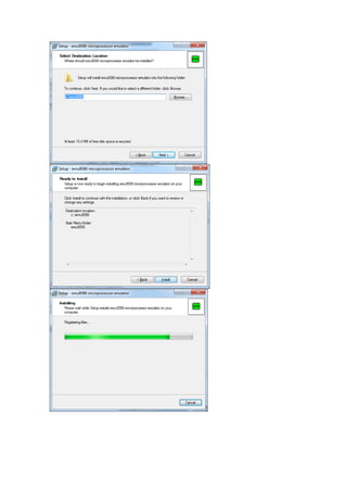 The document contains instructions for compiling and running assembly code in EMU8086 that prints "Hello World" in light red text on a yellow background using direct video memory access. It also includes examples of using assembly instructions like CMP to set the processor's flags and check relationships between values, as well as a short program to calculate the sum of elements in an array.