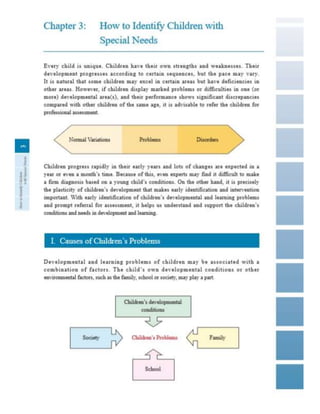 The document provides a history of special education from the 18th century to modern day. It discusses how in the 18th century, enlightenment thinkers like Rousseau influenced new ideas about educating all children according to their needs and abilities. Pioneers in the late 18th century like Charles Michel L'Epeé and Valentin Haüy established the first schools for deaf and blind students. Throughout the 19th century, more schools and programs for disabled students were founded in the US and laws were passed to support special education. Major legislation in the 20th century like IDEA, ADA, and the Rehabilitation Act established legal rights and protections for students with disabilities to receive a free and appropriate public education.